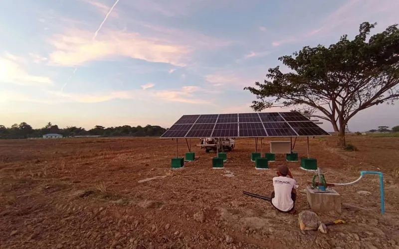 بناءً على مشروع تظاهري لنظام ضخ المياه المدعوم بالطاقة الشمسية، قام سانتيري والشريك المحلي الرائد بالتعاون في استطلاع ميداني يقوده الحكومة، وبعد مراعاة توزيع الأراضي الزراعية والممرات المروية ومستويات مياه نهر إيراوادي، تم تصميم نظام ضخ مياه مدعوم بالطاقة الشمسية بقوة 246 كيلووات ذروة (مضخة 160 كيلووات) و115 كيلووات ذروة، يمكنه ري 2.502 فداناً من الأراضي الزراعية. لذا، استعادت البلاد تدريجياً الإنتاج الزراعي والاقتصاد، وأصبحت تحقق حصاد المحاصيل في كل من موسمي الجفاف والأمطار.